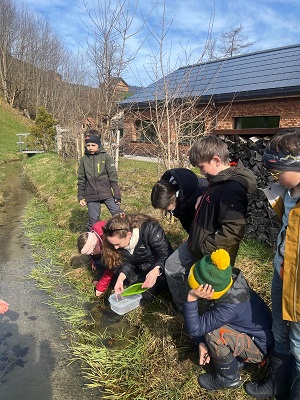 Passend zu unserem NMG-Thema "Amphibien" ziehen wir im Schulzimmer Kaulquappen gross. Zuerst holten wir uns im nahegelegenen Bächli 20 Froscheier sowie genug Bachwasser für das Aquarium.